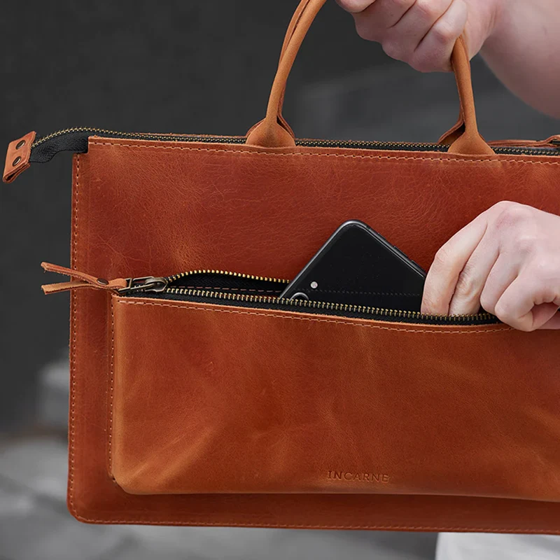 Шкіряний чохол дуже зручний та практичний в експлуатації, а його стильний дизайн зробить його чудовим вибором для сучасної людини, яка прагне захистити свій ноутбук та підкреслити свій стиль. Головне відділення та кишеня для зарядного пристрою щільно закриваються металевою блискавкою, що забезпечує захист вашого ноутбука від пилу, вологи та інших зовнішніх впливів.